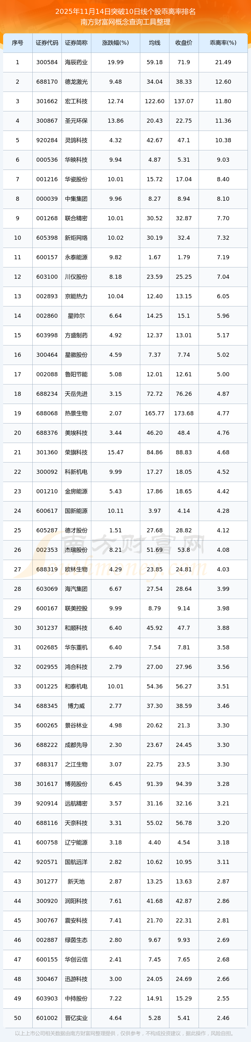 2025年11月14日突破10日線個(gè)股乖離率排名