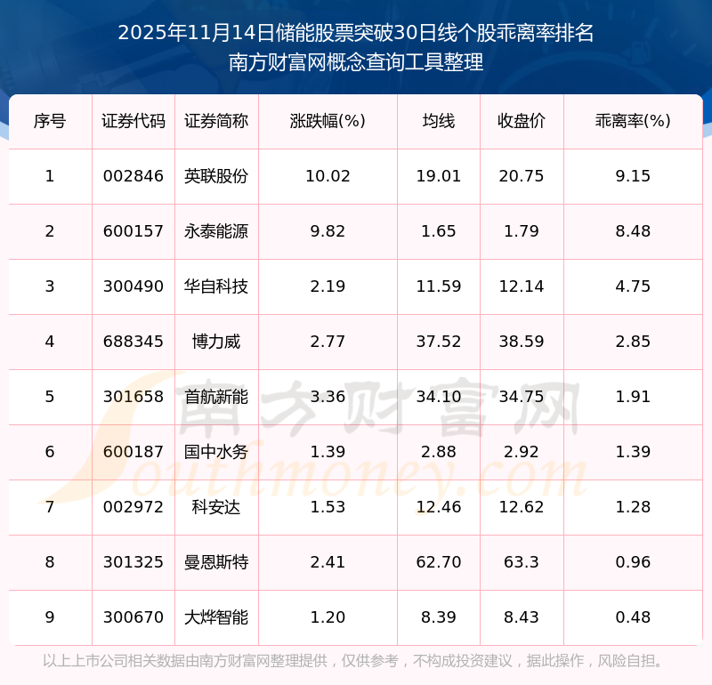 2025年11月14日儲能股票突破30日線個股乖離率排名