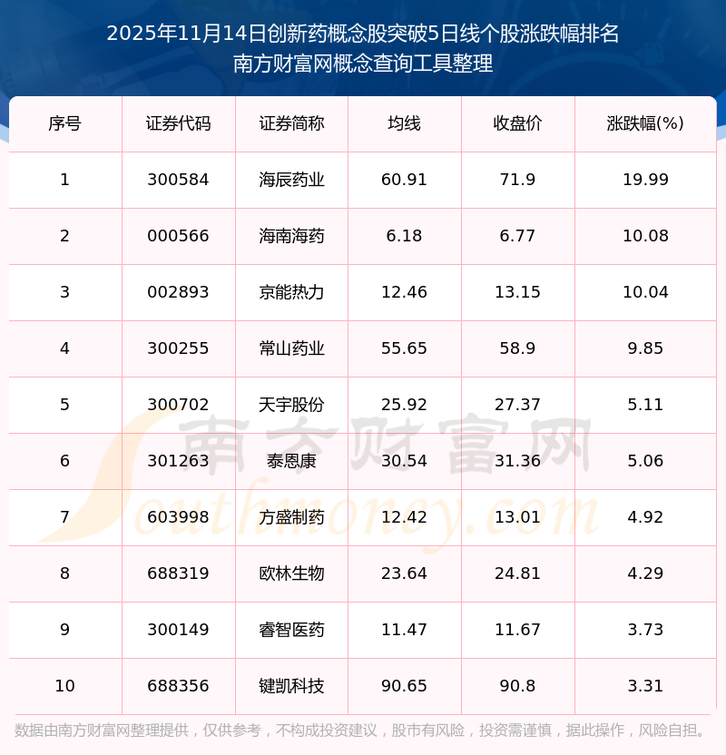 根據(jù)南方財富網(wǎng)概念查詢工具數(shù)據(jù)統(tǒng)計,截止2025年11月14日收盤,創(chuàng)新藥概念股共有23只個股收盤價向上突破了5日線。其中漲幅較大的個股有海辰藥業(yè)、海南海藥、京能熱力等,漲幅分別為19.99%、10.08%、10.04%。