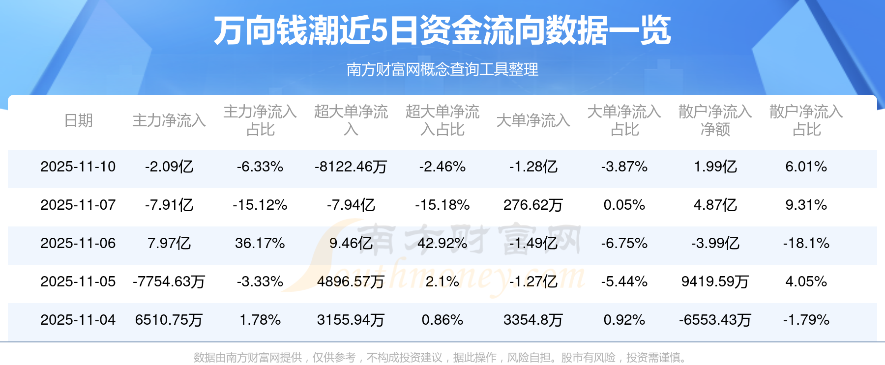 11月10日消息,萬向錢潮主力凈流出2.09億元,超大單凈流出8122.46萬元,散戶凈流入1.99億元。