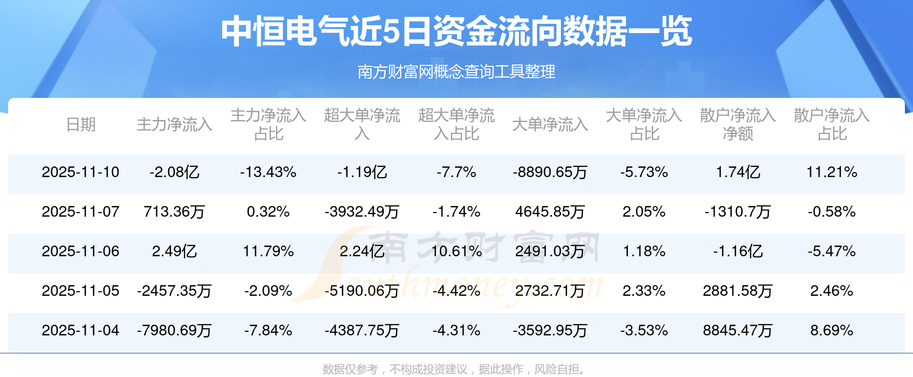 11月10日消息,中恒電氣主力凈流出2.08億元,超大單凈流出1.19億元,散戶凈流入1.74億元。