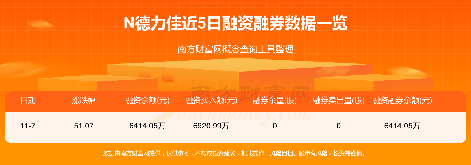 N德力佳11月7日融券信息顯示,融資方面,當(dāng)日融資買(mǎi)入6920.99萬(wàn)元,融資償還506.94萬(wàn)元,融資凈買(mǎi)額6414.05萬(wàn)元。近5日融資融券數(shù)據(jù)一覽見(jiàn)下表: