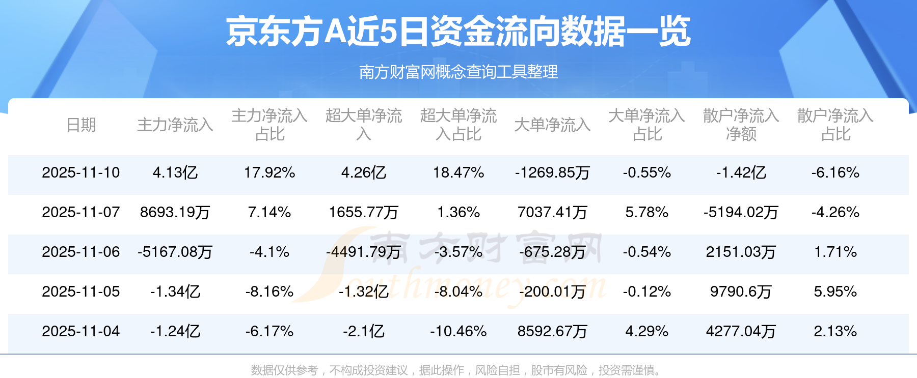 11月10日消息,京東方A11月10日主力凈流入4.13億元,超大單凈流入4.26億元,大單凈流出1269.85萬元,散戶凈流出1.42億元。