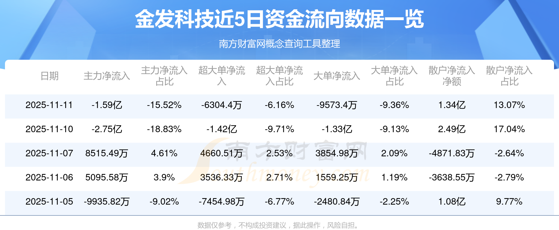 11月11日該股主力資金凈流出1.59億元,超大單資金凈流出6304.4萬元,大單資金凈流出9573.4萬元,中單資金凈流入2507.65萬元,散戶資金凈流入1.34億元。