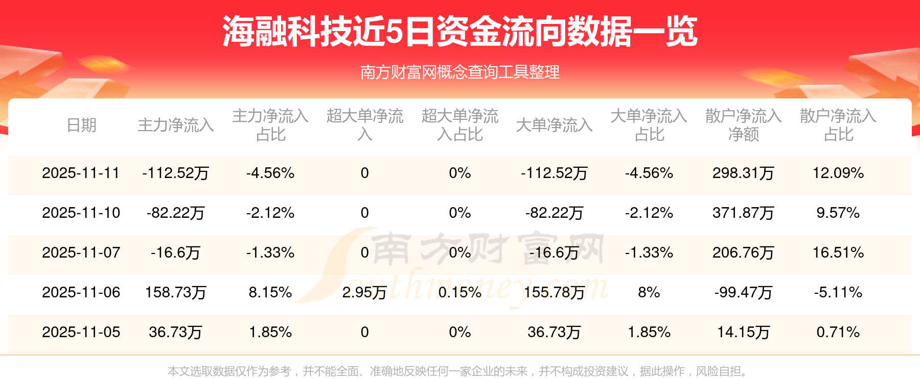 11月11日消息,海融科技主力資金凈流出112.52萬元,散戶資金凈流入298.31萬元。
