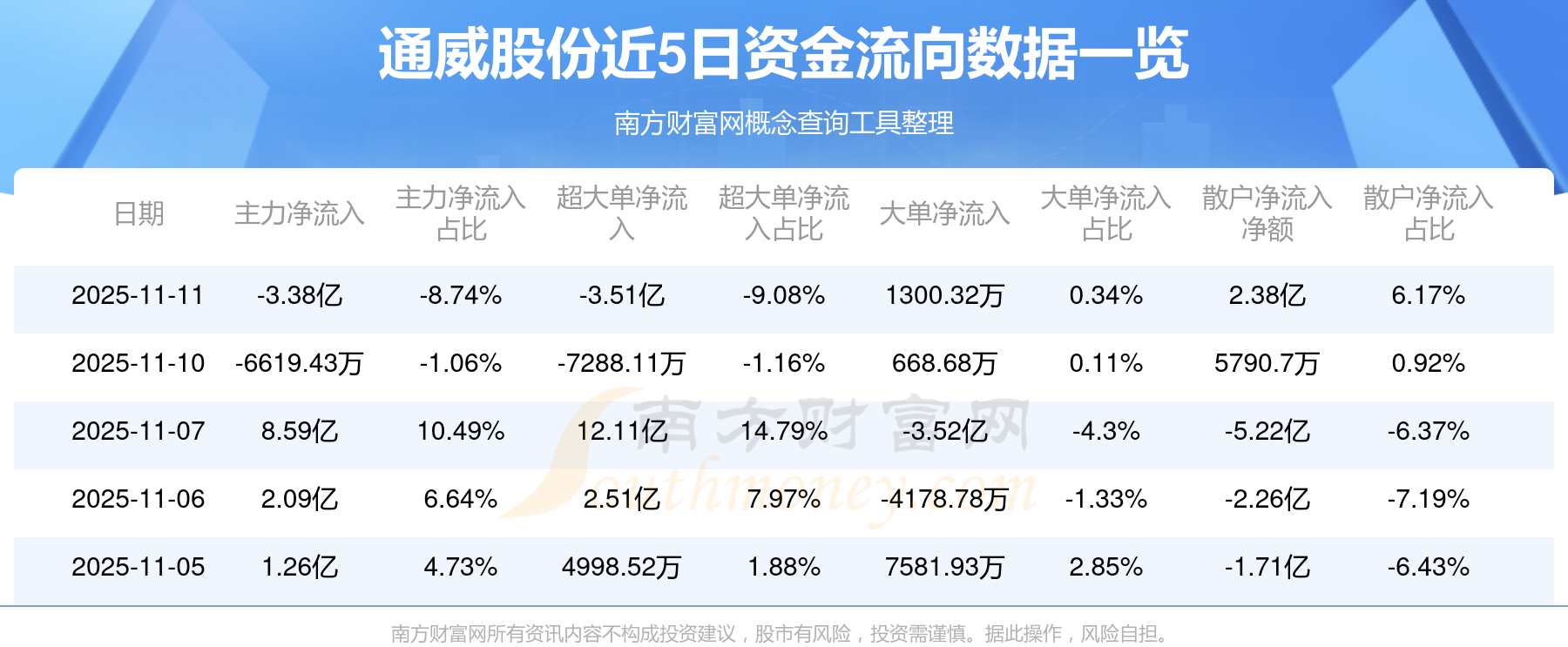 11月11日該股主力資金凈流出3.38億元,超大單資金凈流出3.51億元,大單資金凈流入1300.32萬(wàn)元,中單資金凈流入9939.78萬(wàn)元,散戶資金凈流入2.38億元。