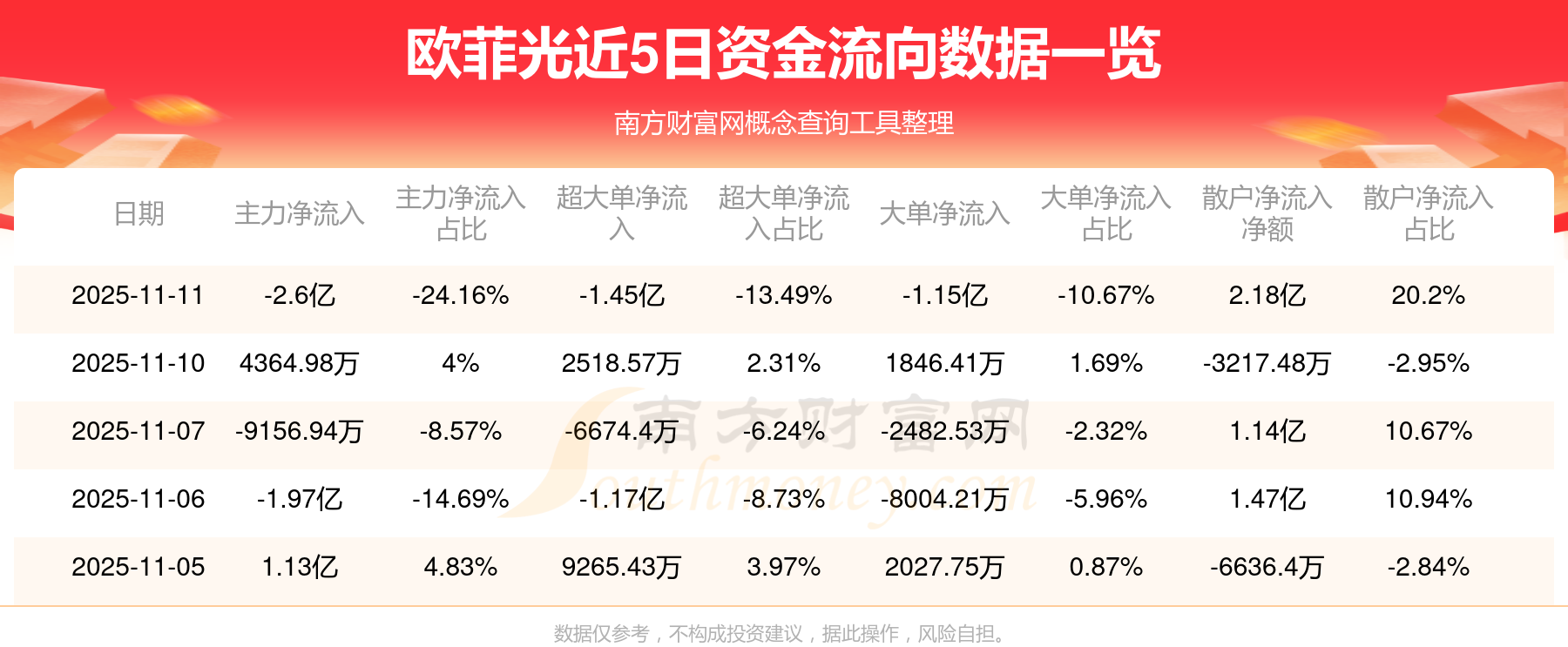 11月11日消息,歐菲光資金凈流出2.6億元,超大單凈流出1.45億元,換手率1.95%,成交金額7.95億元。