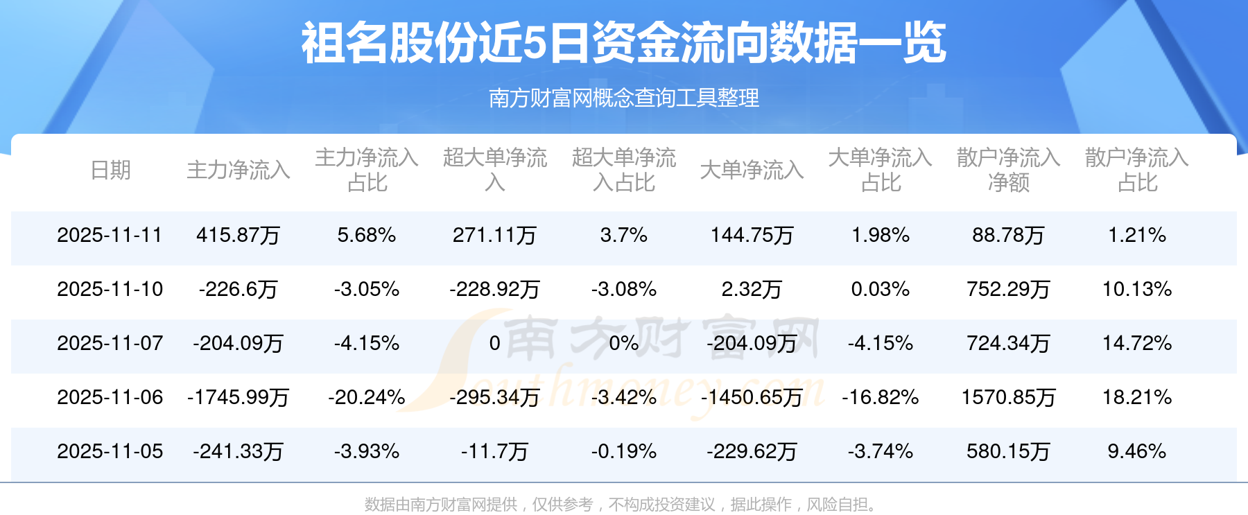 11月11日消息,祖名股份資金凈流入415.87萬(wàn)元,超大單凈流入271.11萬(wàn)元,換手率3.43%,成交金額5862.49萬(wàn)元。