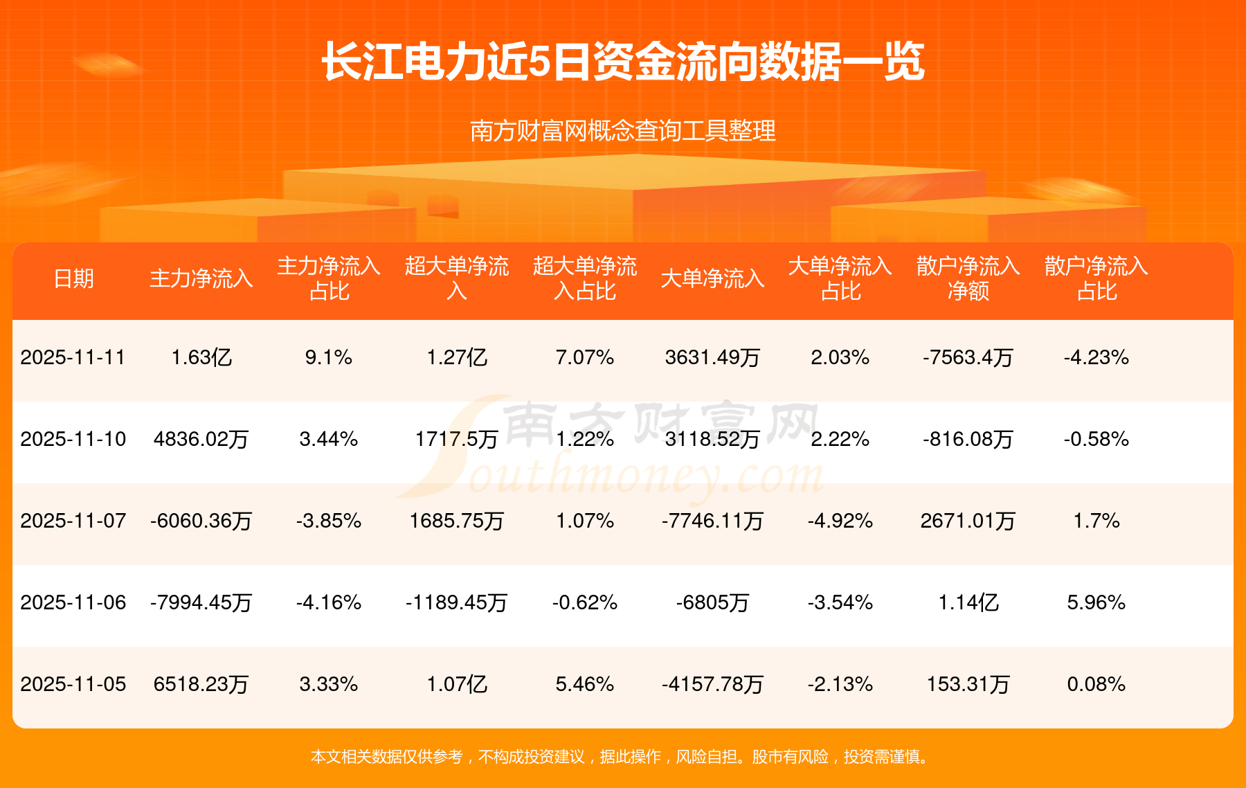 11月11日消息,長(zhǎng)江電力資金凈流入1.63億元,超大單凈流入1.27億元,換手率0.21%,成交金額14.61億元。