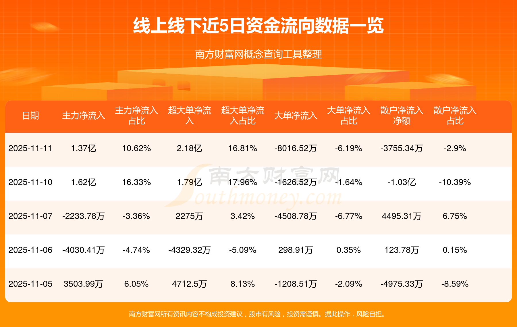 11月11日消息,線上線下11月11日主力凈流入1.37億元,超大單凈流入2.18億元,大單凈流出8016.52萬元,散戶凈流出3755.34萬元。