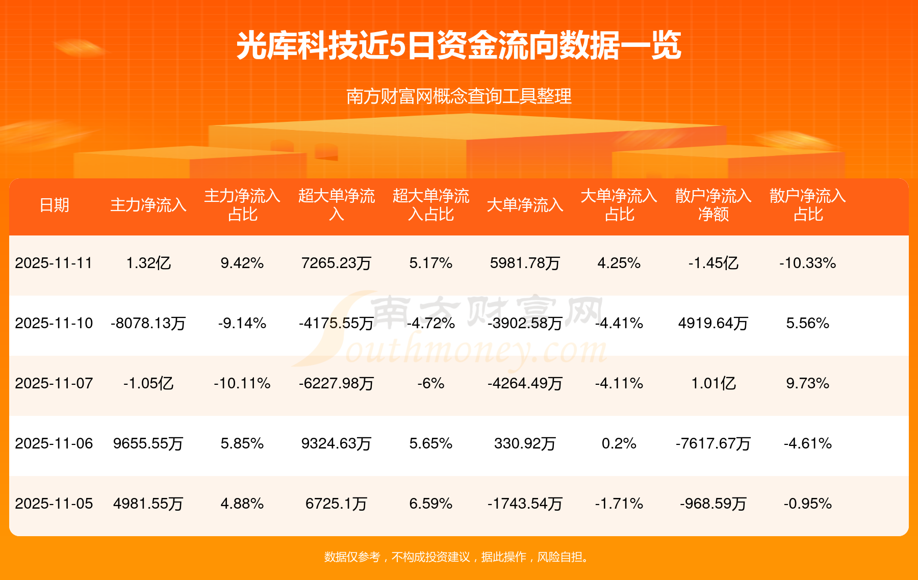 11月11日消息,光庫科技11月11日主力凈流入1.32億元,超大單凈流入7265.23萬元,大單凈流入5981.78萬元,散戶凈流出1.45億元。