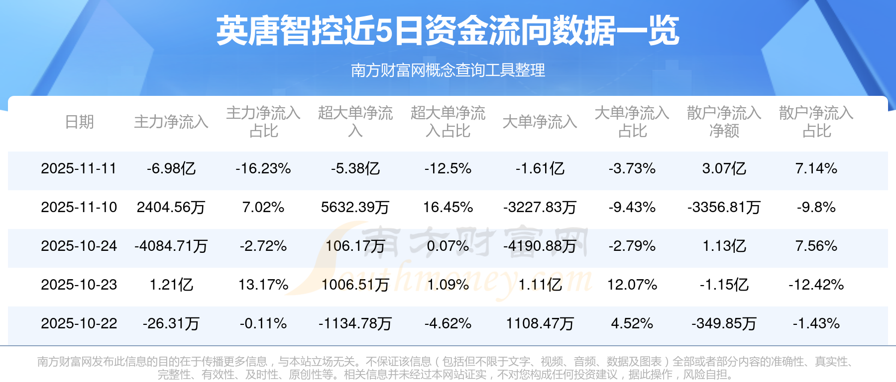 11月11日消息,英唐智控主力資金凈流出6.98億元,超大單資金凈流出5.38億元,散戶資金凈流入3.07億元。