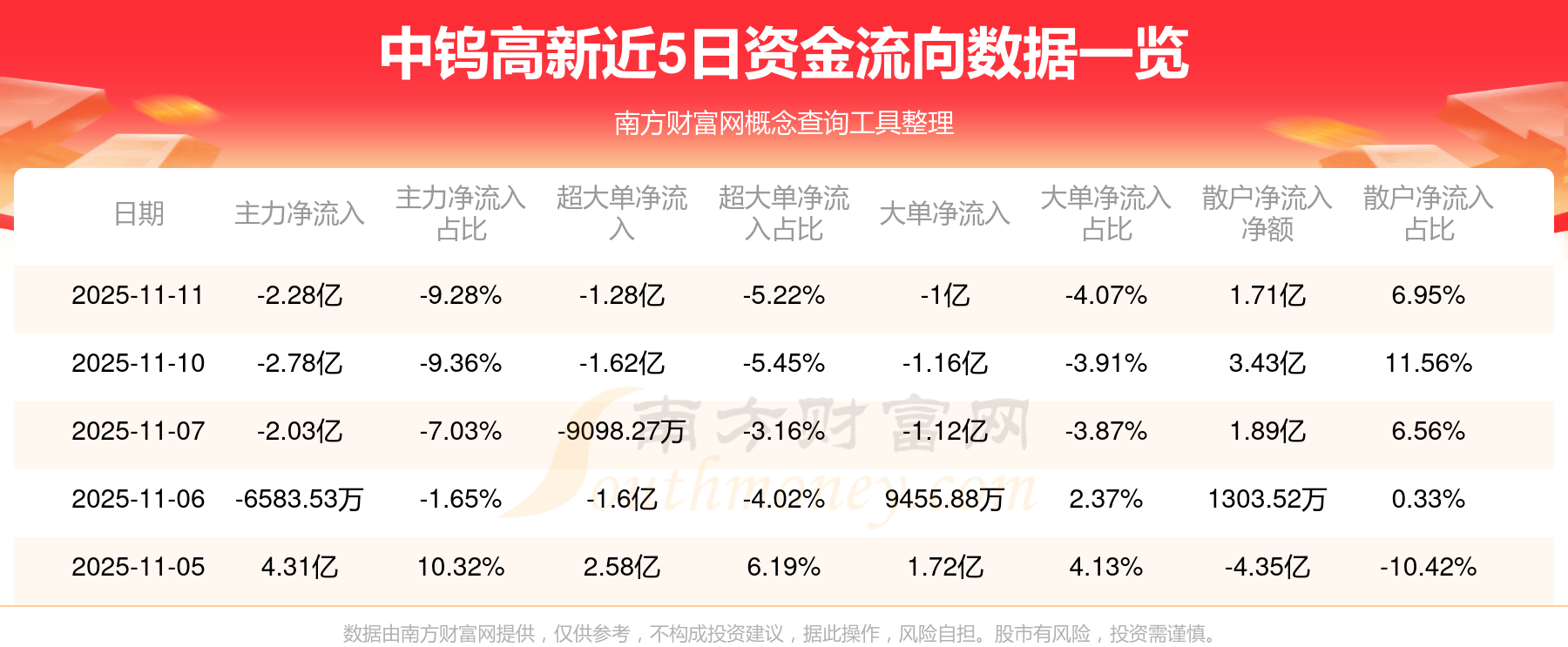11月11日消息,中鎢高新11月11日主力資金凈流出2.28億元,超大單資金凈流出1.28億元,大單資金凈流出1億元,散戶資金凈流入1.71億元。