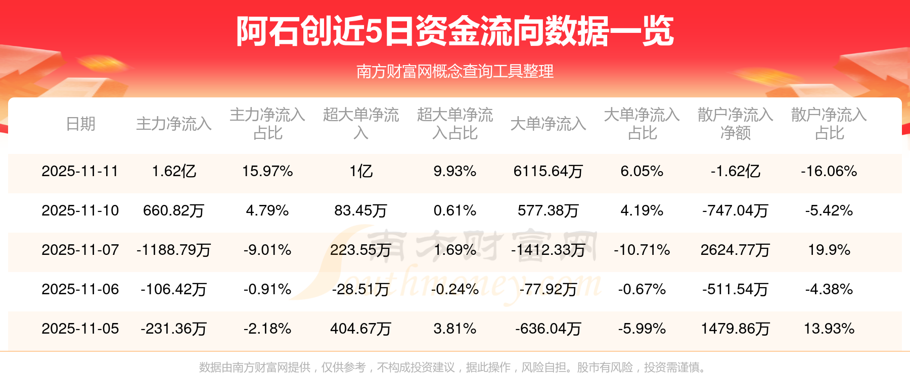 資金流向數(shù)據(jù)方面,11月11日主力資金凈流流入1.62億元,超大單資金凈流入1億元,大單資金凈流入6115.64萬元,散戶資金凈流出1.62億元。
