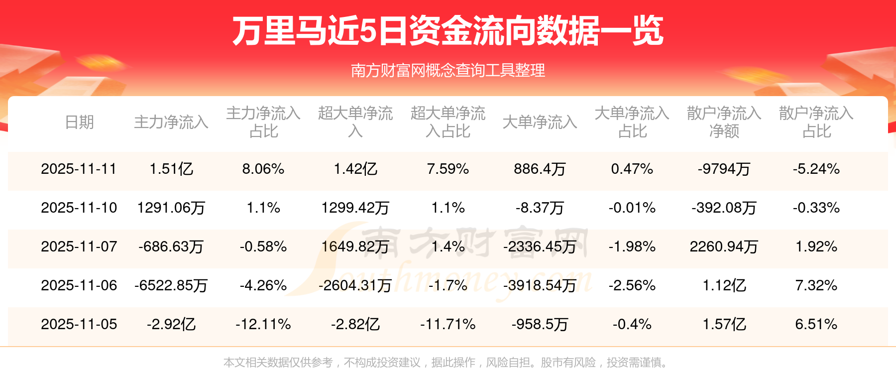 11月11日消息,萬里馬主力凈流入1.51億元,超大單凈流入1.42億元,散戶凈流出9794萬元。