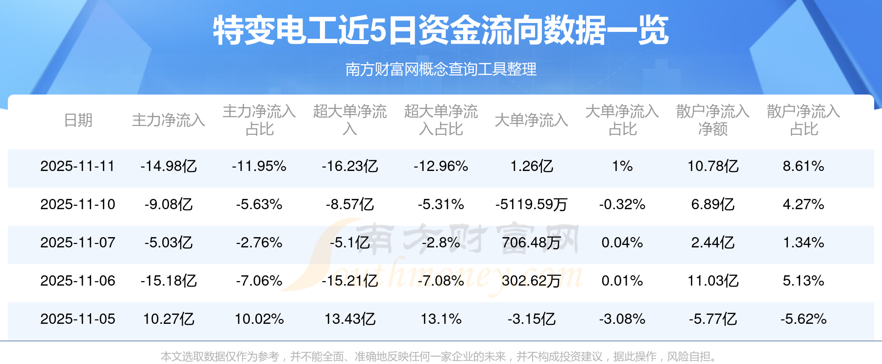 11月11日主力資金凈流出14.98億元,超大單資金凈流出16.23億元,換手率7.52%,成交金額98.35億元。