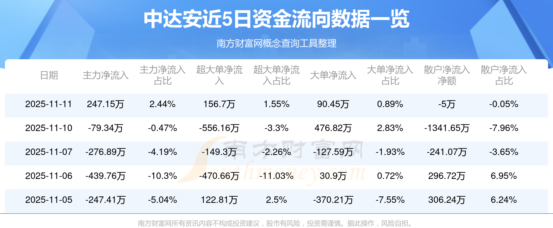【11月10日】今日中達(dá)安(300635)主力凈流入凈額247.15萬元,占比2.44%。該股開盤報(bào)15.87元,收于15.460元,漲3.67%,總市值為21.66億元,換手率4.5%。