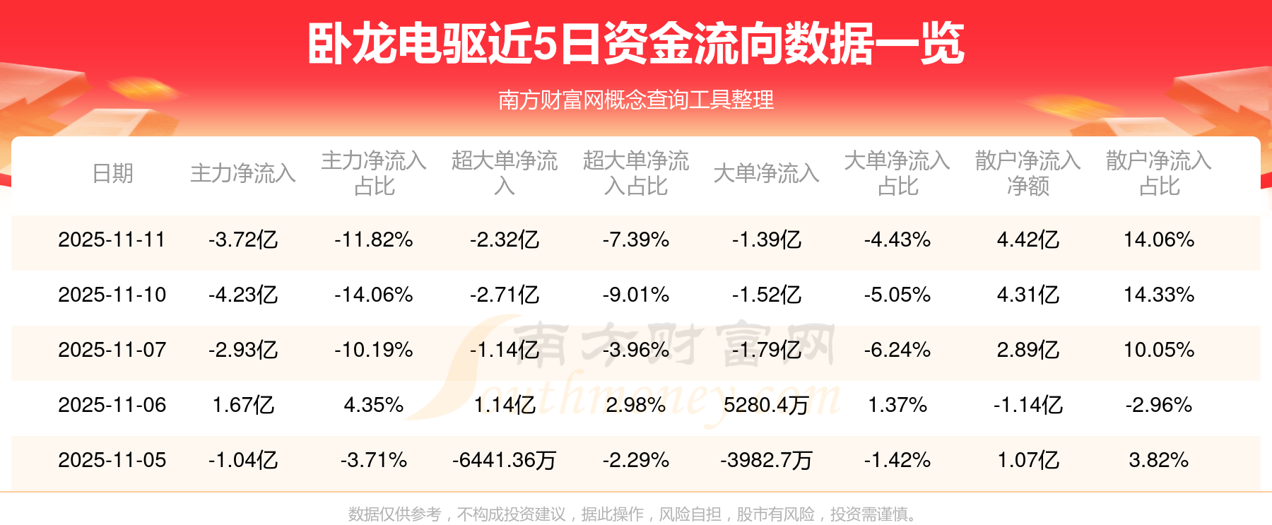 11月11日消息,臥龍電驅(qū)主力凈流出3.72億元,超大單凈流出2.32億元,散戶凈流入4.42億元。