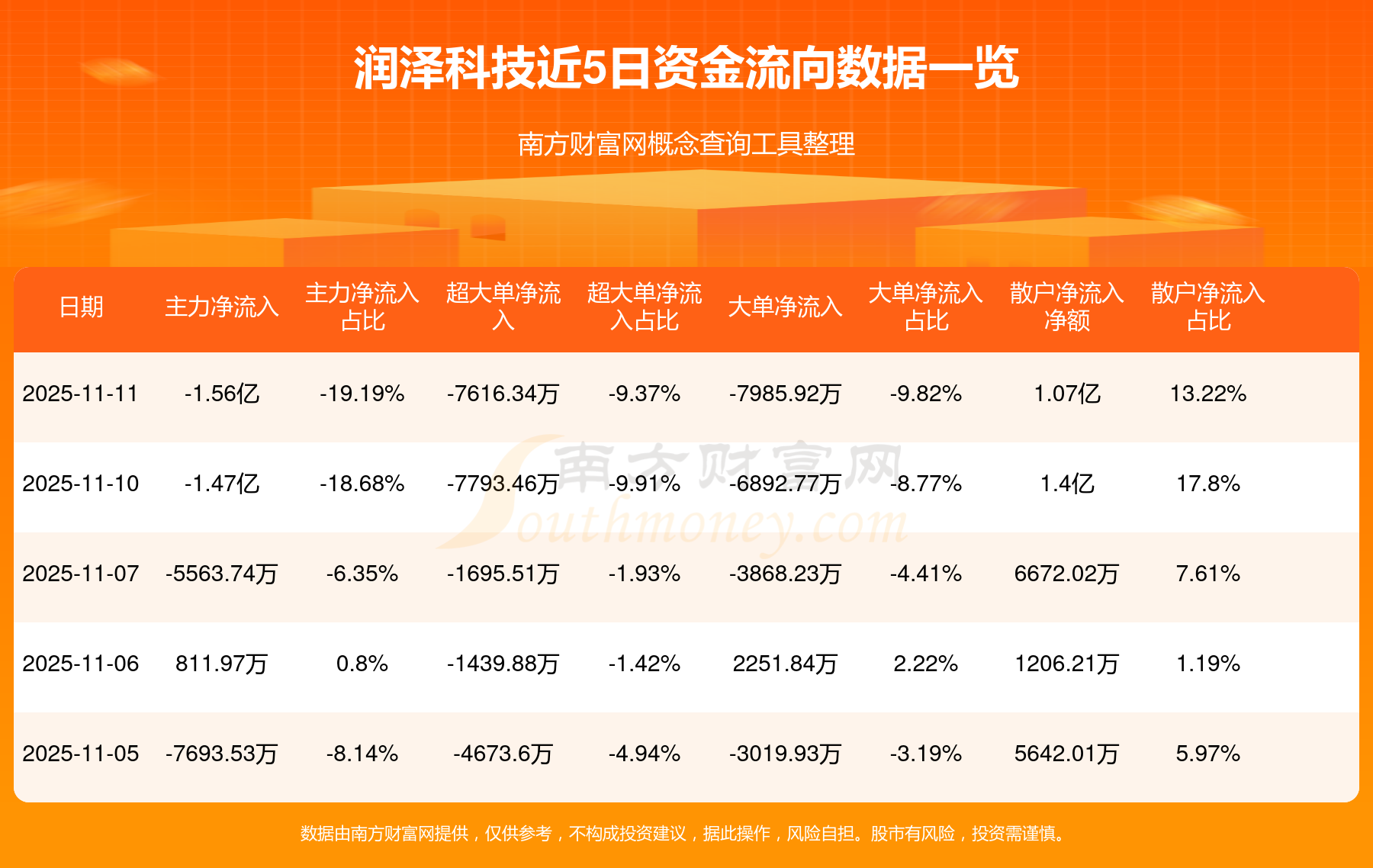 11月11日消息,潤澤科技11月11日主力資金凈流出1.56億元,超大單資金凈流出7616.34萬元,大單資金凈流出7985.92萬元,散戶資金凈流入1.07億元。