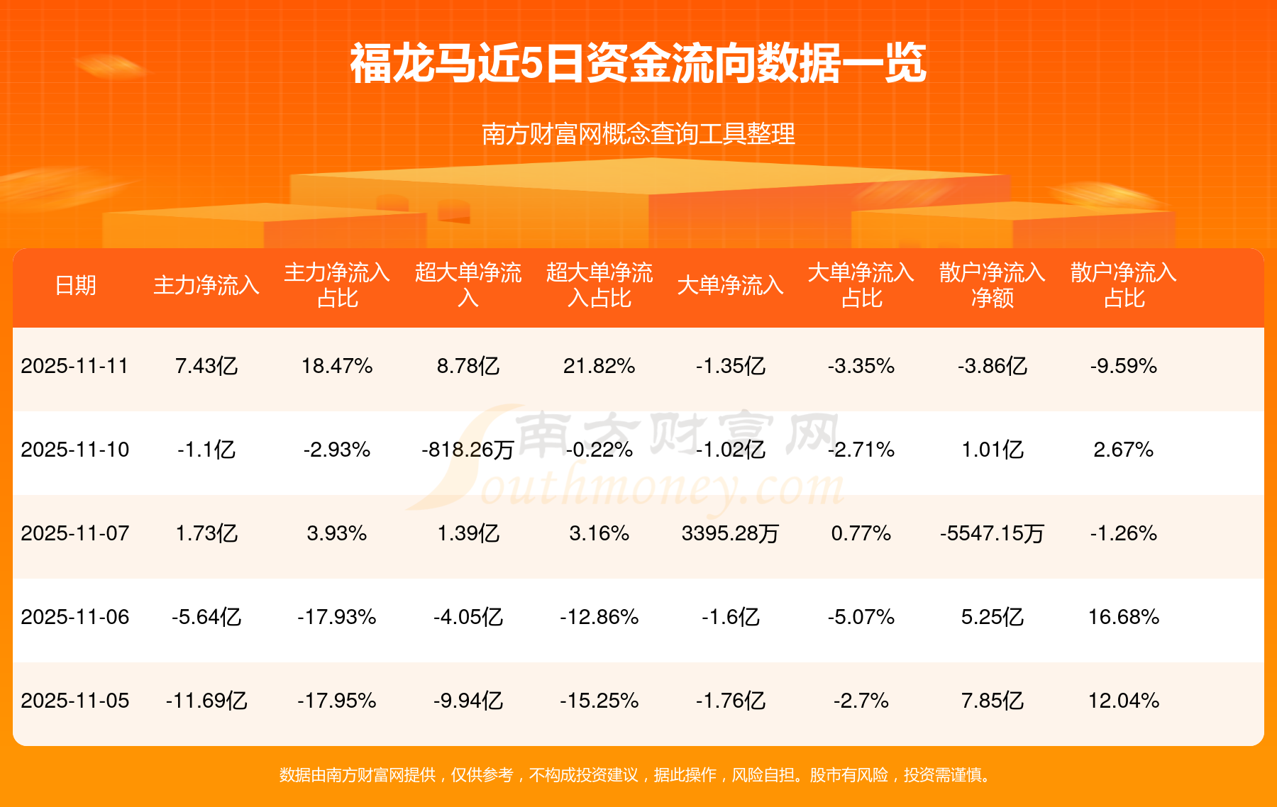 11月11日該股主力資金凈流入7.43億元,超大單資金凈流入8.78億元,大單資金凈流出1.35億元,中單資金凈流出3.58億元,散戶資金凈流出3.86億元。