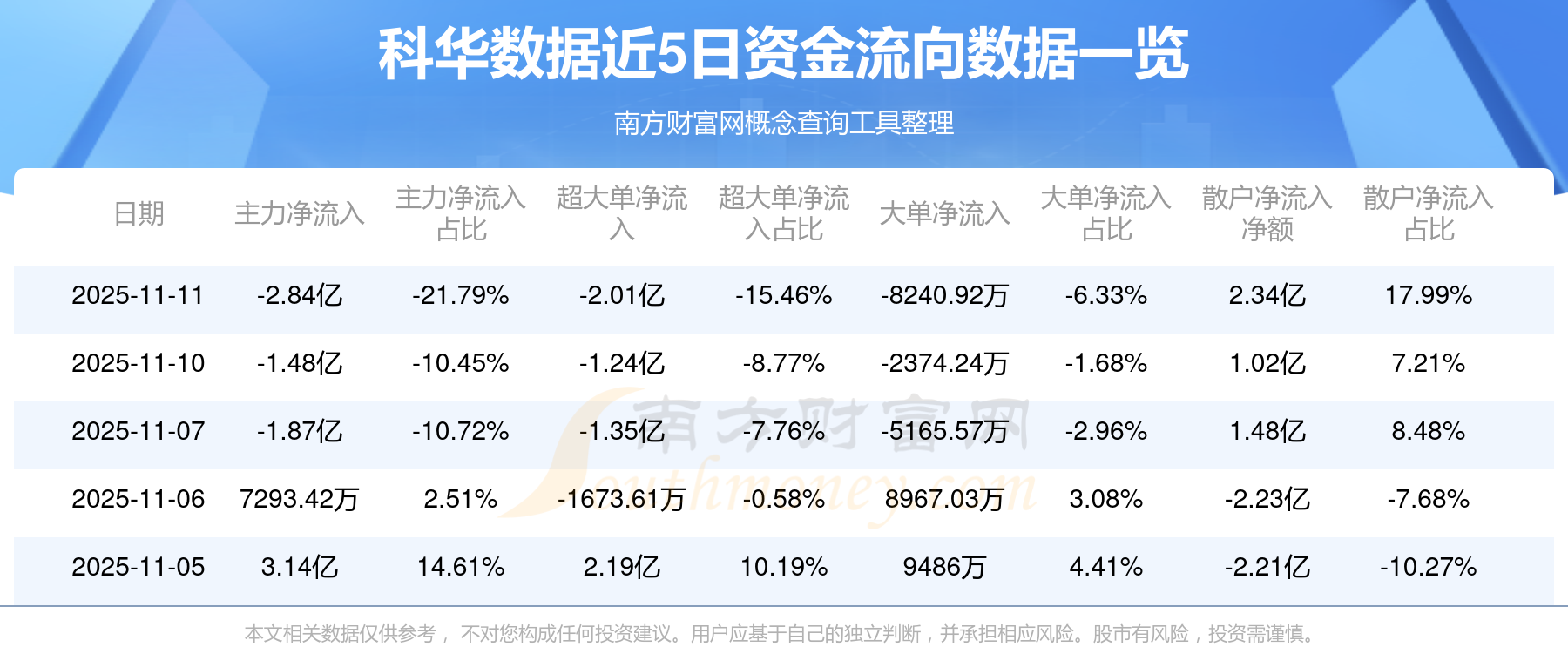 11月11日消息,科華數(shù)據(jù)11月11日主力資金凈流出2.84億元,超大單資金凈流出2.01億元,大單資金凈流出8240.92萬元,散戶資金凈流入2.34億元。