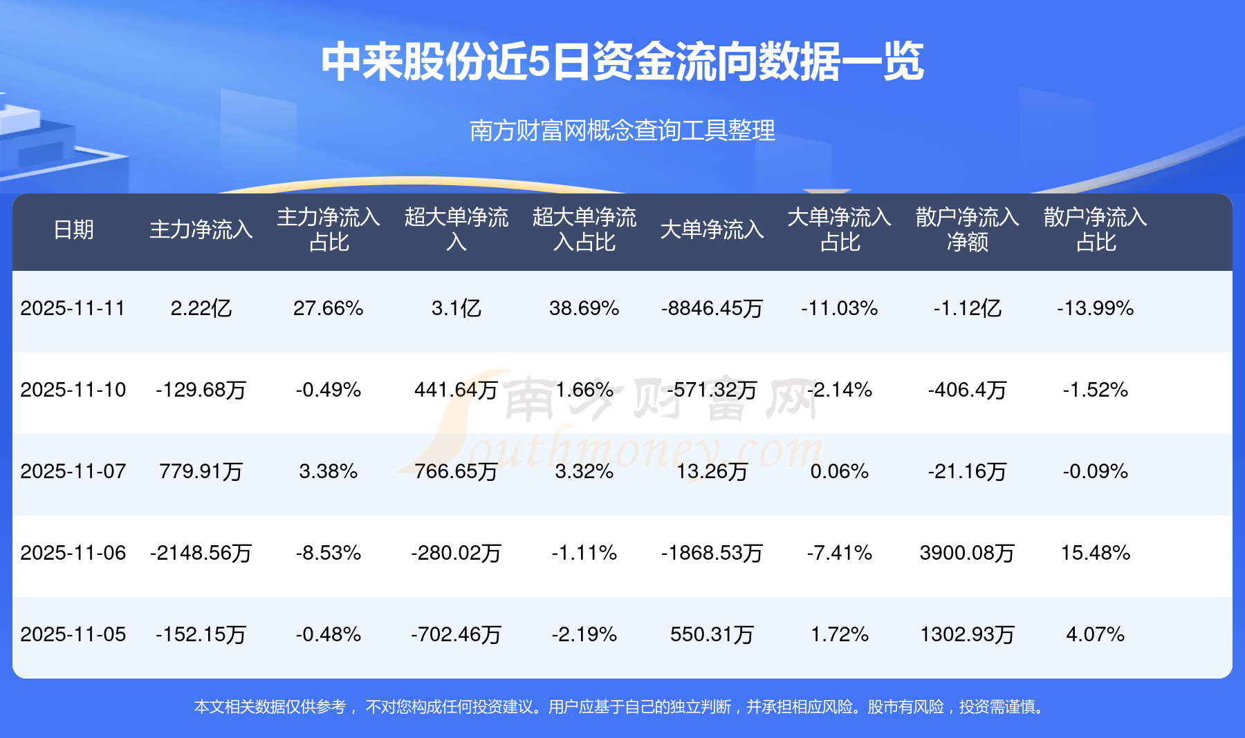 11月11日該股主力凈流入2.22億元,超大單凈流入3.1億元,大單凈流出8846.45萬元,中單凈流出1.1億元,散戶凈流出1.12億元。