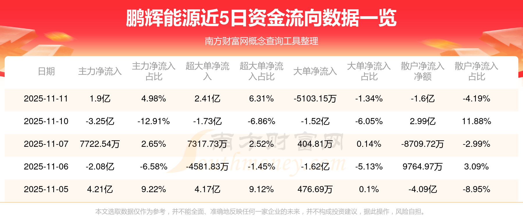 11月11日消息,鵬輝能源主力凈流入1.9億元,超大單凈流入2.41億元,散戶凈流出1.6億元。