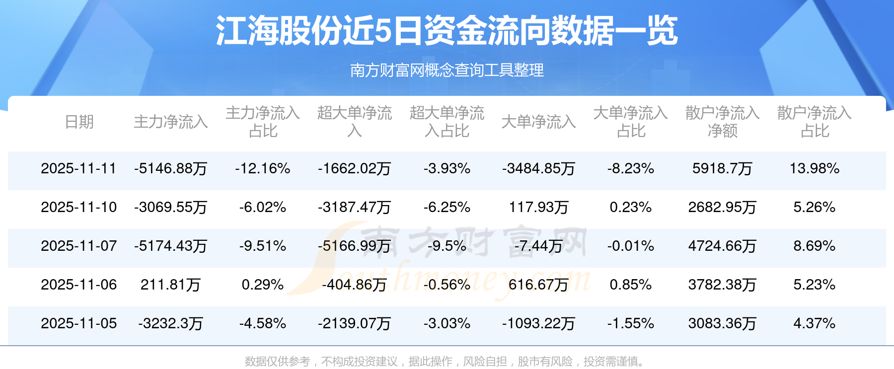 資金流向數(shù)據(jù)方面,11月11日主力資金凈流流出5146.88萬(wàn)元,超大單資金凈流出1662.02萬(wàn)元,大單資金凈流出3484.85萬(wàn)元,散戶資金凈流入5918.7萬(wàn)元。
