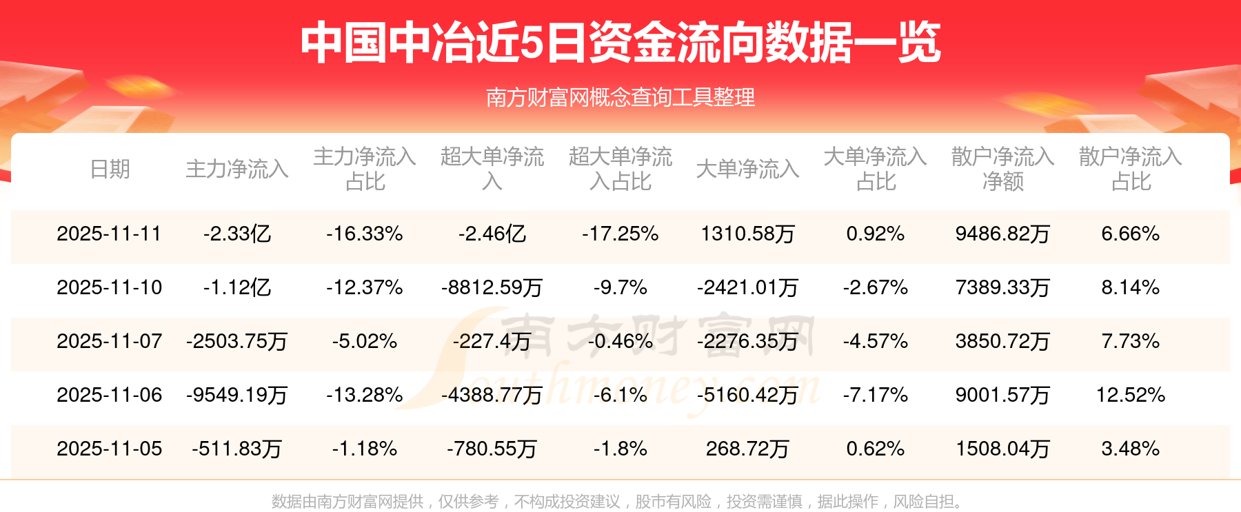 11月11日消息,中國中冶11月11日主力凈流出2.33億元,超大單凈流出2.46億元,大單凈流入1310.58萬元,散戶凈流入9486.82萬元。