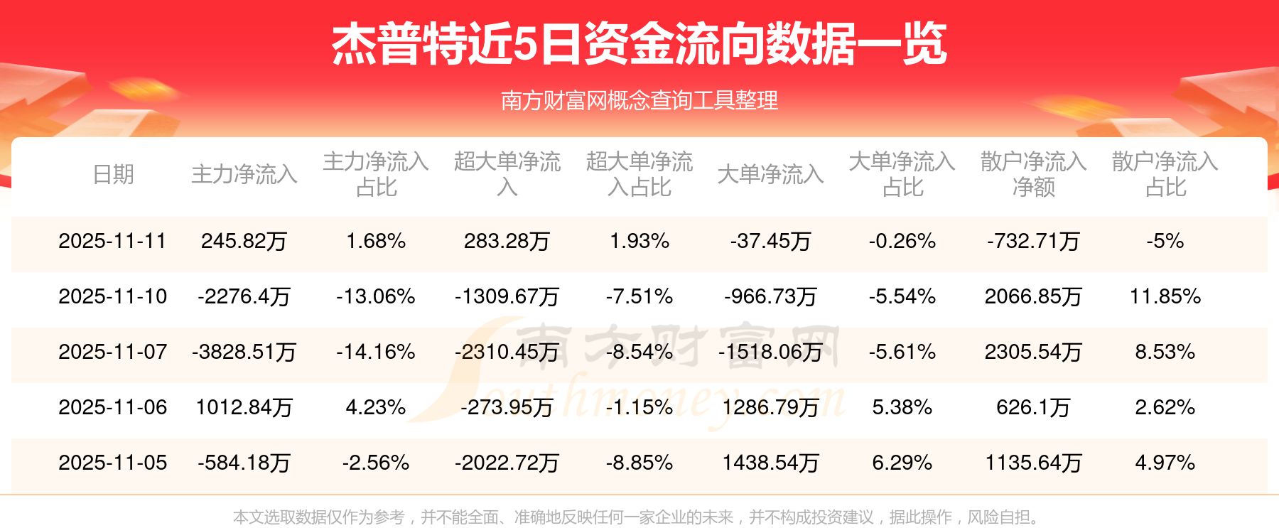 11月11日消息,杰普特主力凈流入245.82萬元,超大單凈流入283.28萬元,散戶凈流出732.71萬元。