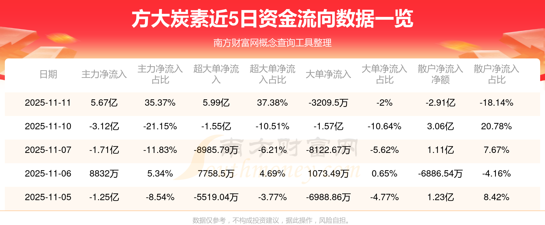 11月11日消息,方大炭素主力資金凈流入5.67億元,超大單資金凈流入5.99億元,散戶資金凈流出2.91億元。