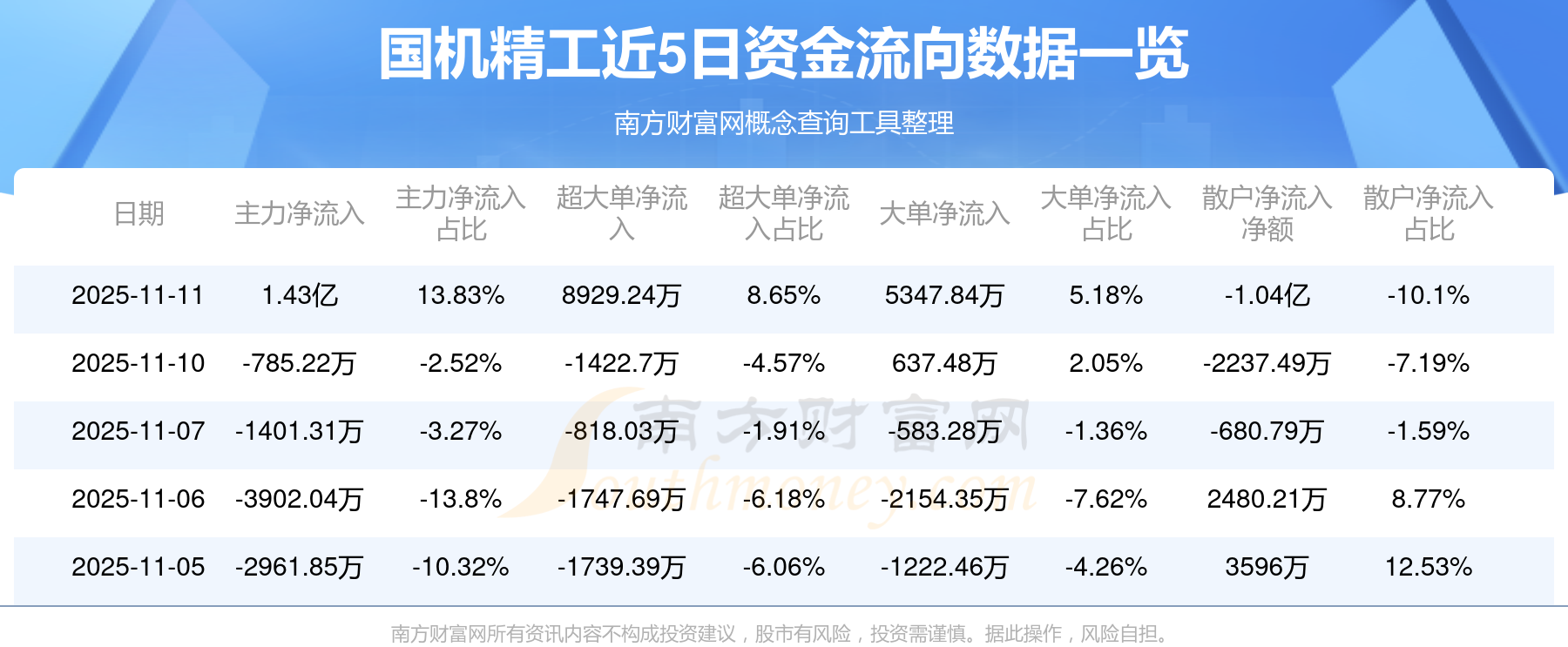 11月11日該股主力凈流入1.43億元,超大單凈流入8929.24萬元,大單凈流入5347.84萬元,中單凈流出3849.68萬元,散戶凈流出1.04億元。