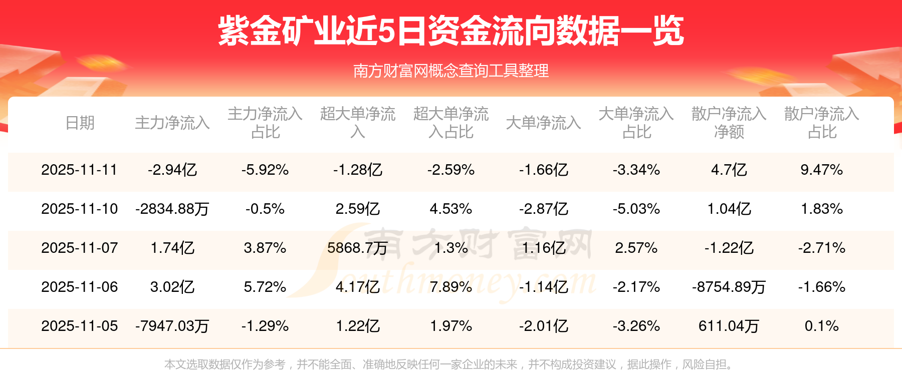 11月11日消息,紫金礦業(yè)主力資金凈流出2.94億元,超大單資金凈流出1.28億元,散戶資金凈流入4.7億元。