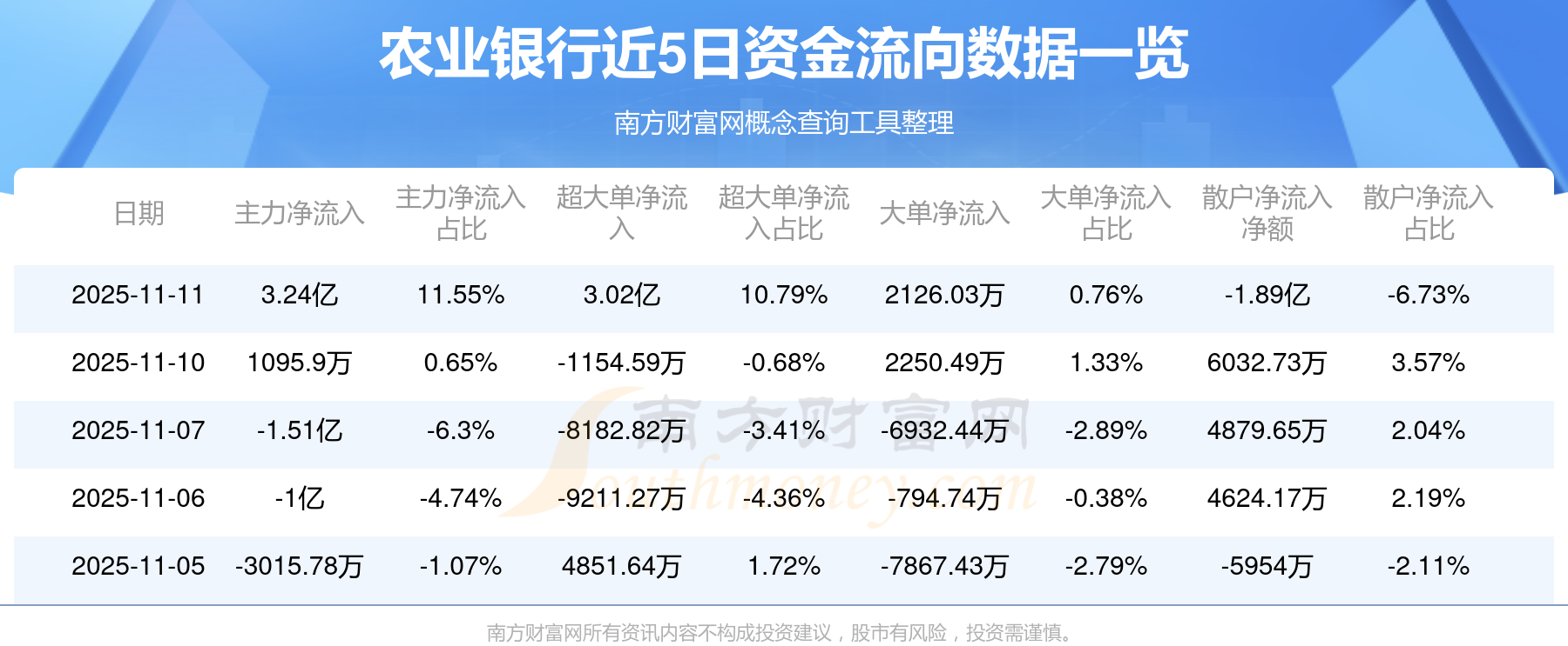 11月11日消息,農(nóng)業(yè)銀行主力凈流入3.24億元,超大單凈流入3.02億元,散戶凈流出1.89億元。