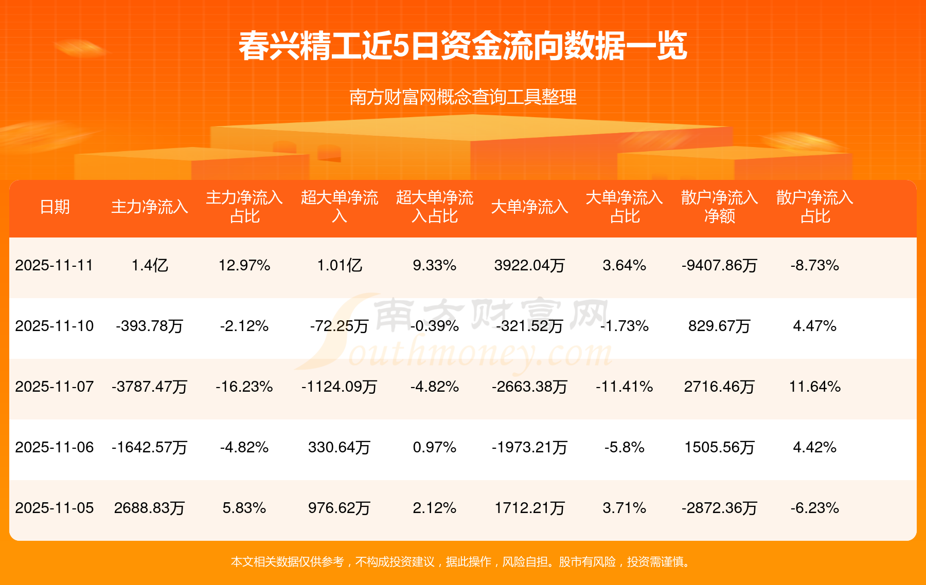 11月11日消息,春興精工11月11日主力資金凈流入1.4億元,超大單資金凈流入1.01億元,大單資金凈流入3922.04萬元,散戶資金凈流出9407.86萬元。