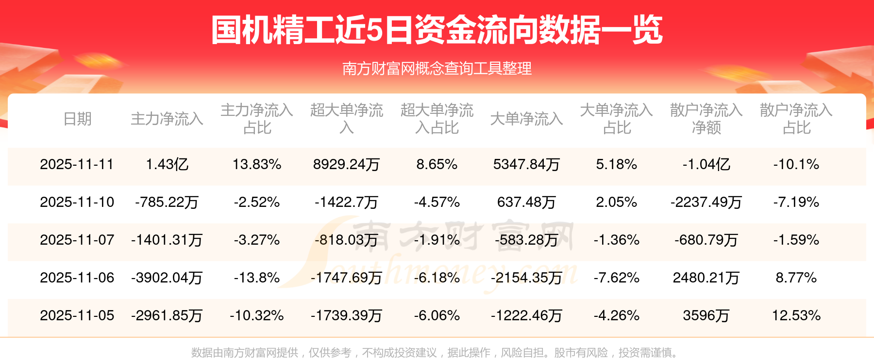 11月11日消息,國(guó)機(jī)精工11月11日主力凈流入1.43億元,超大單凈流入8929.24萬元,大單凈流入5347.84萬元,散戶凈流出1.04億元。