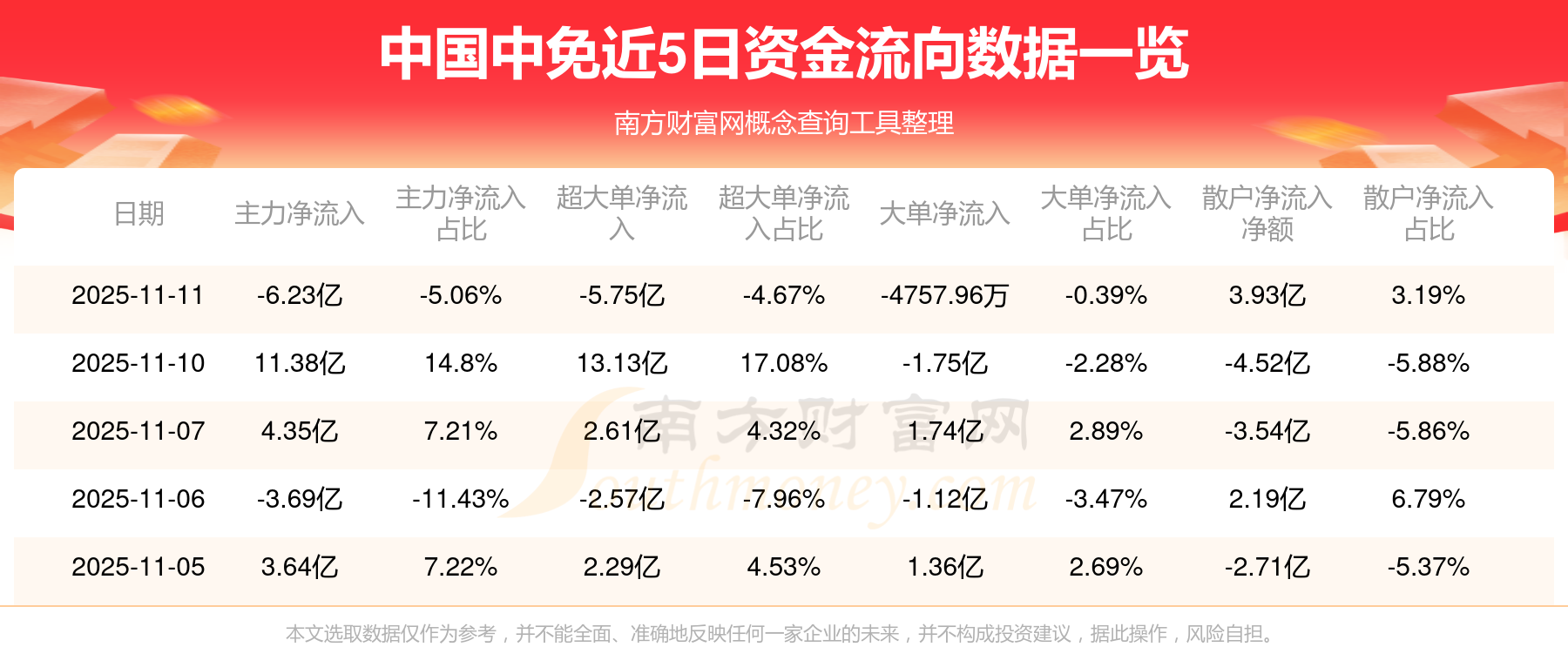 11月11日消息,中國中免主力凈流出6.23億元,超大單凈流出5.75億元,散戶凈流入3.93億元。