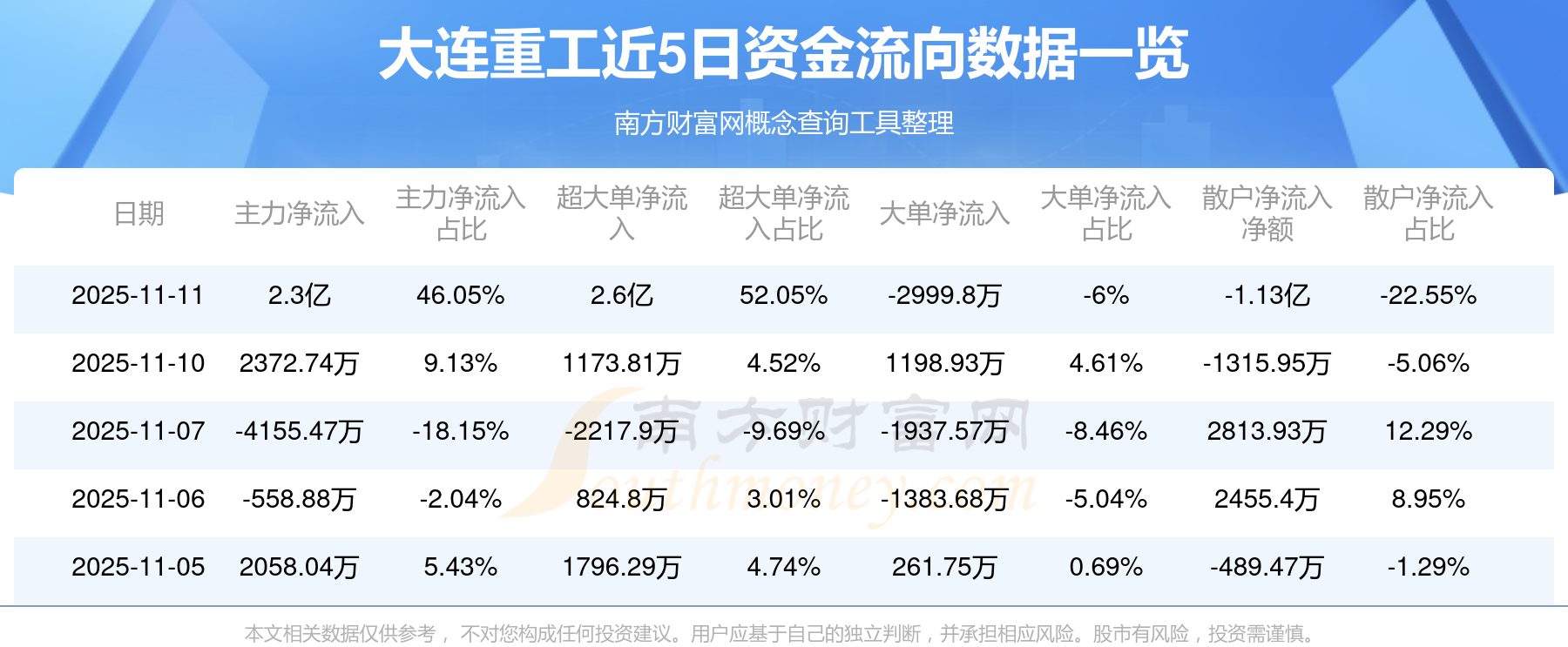 11月11日消息,大連重工主力資金凈流入2.3億元,超大單資金凈流入2.6億元,散戶(hù)資金凈流出1.13億元。