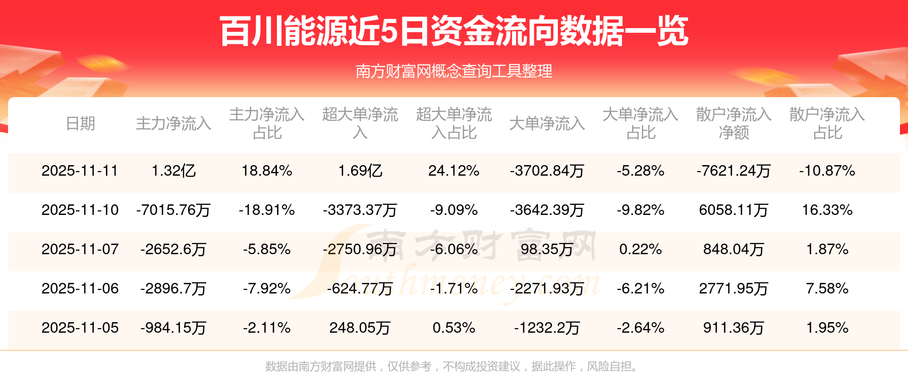 11月11日消息,百川能源11月11日主力資金凈流入1.32億元,超大單資金凈流入1.69億元,大單資金凈流出3702.84萬元,散戶資金凈流出7621.24萬元。