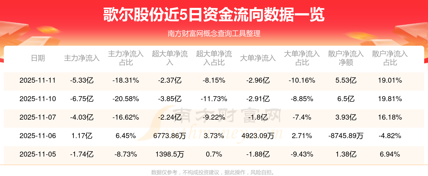 11月11日消息,歌爾股份11月11日主力資金凈流出5.33億元,超大單資金凈流出2.37億元,大單資金凈流出2.96億元,散戶資金凈流入5.53億元。