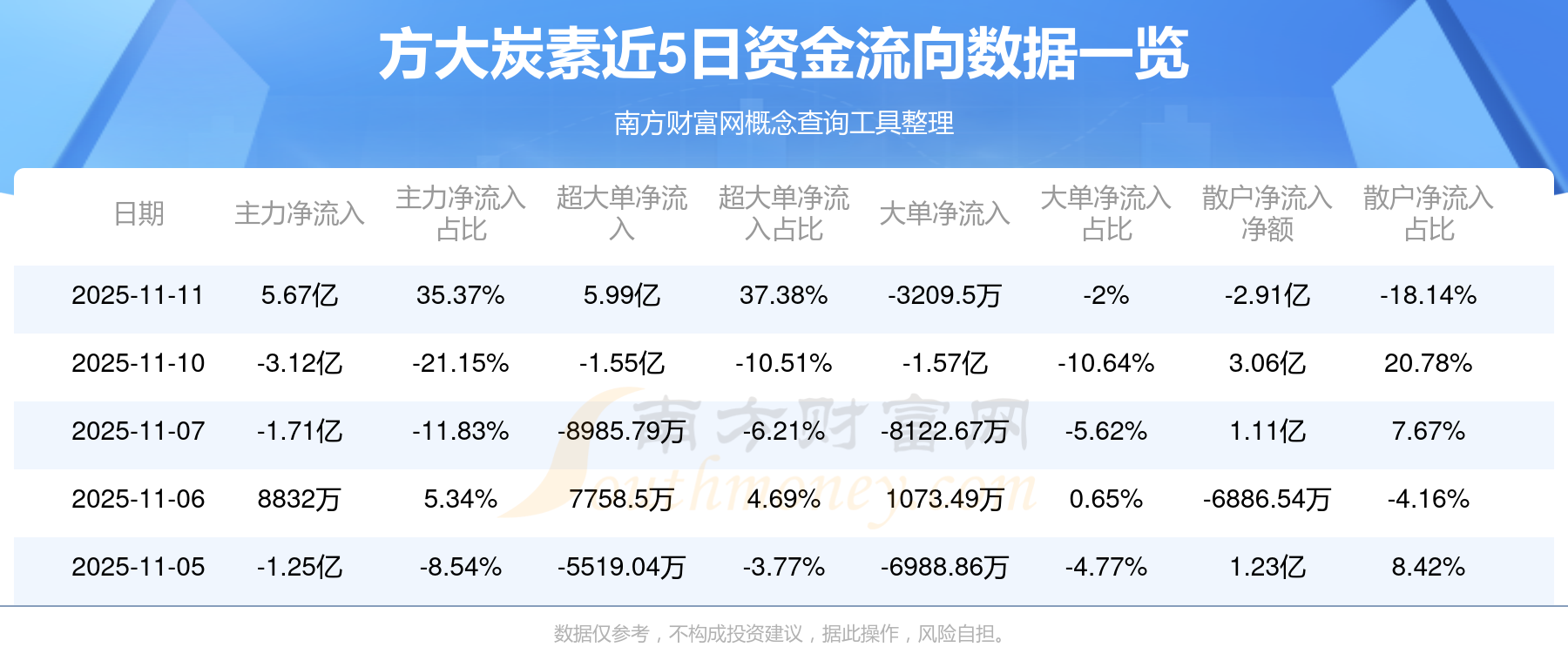 11月11日該股主力凈流入5.67億元,超大單凈流入5.99億元,大單凈流出3209.5萬元,中單凈流出2.76億元,散戶凈流出2.91億元。