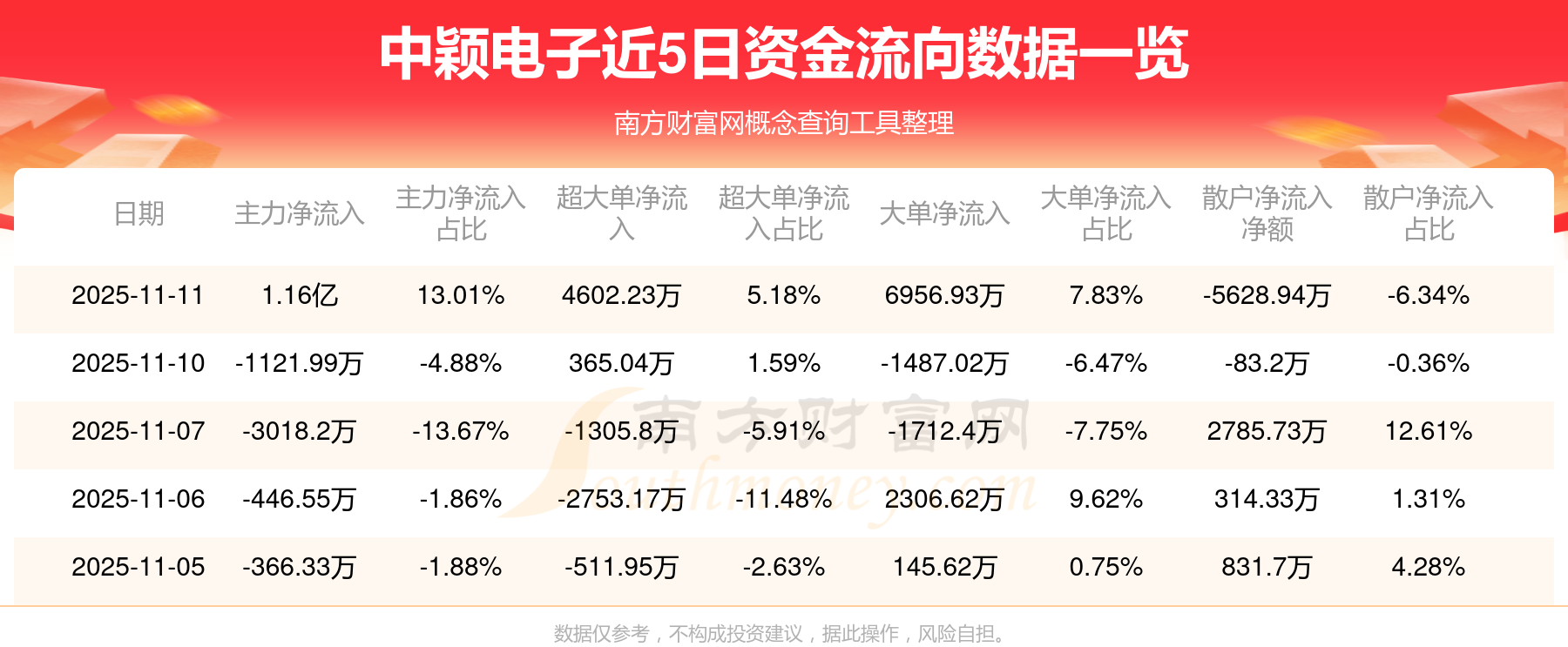 11月11日消息,中穎電子11月11日主力資金凈流入1.16億元,超大單資金凈流入4602.23萬元,大單資金凈流入6956.93萬元,散戶資金凈流出5628.94萬元。