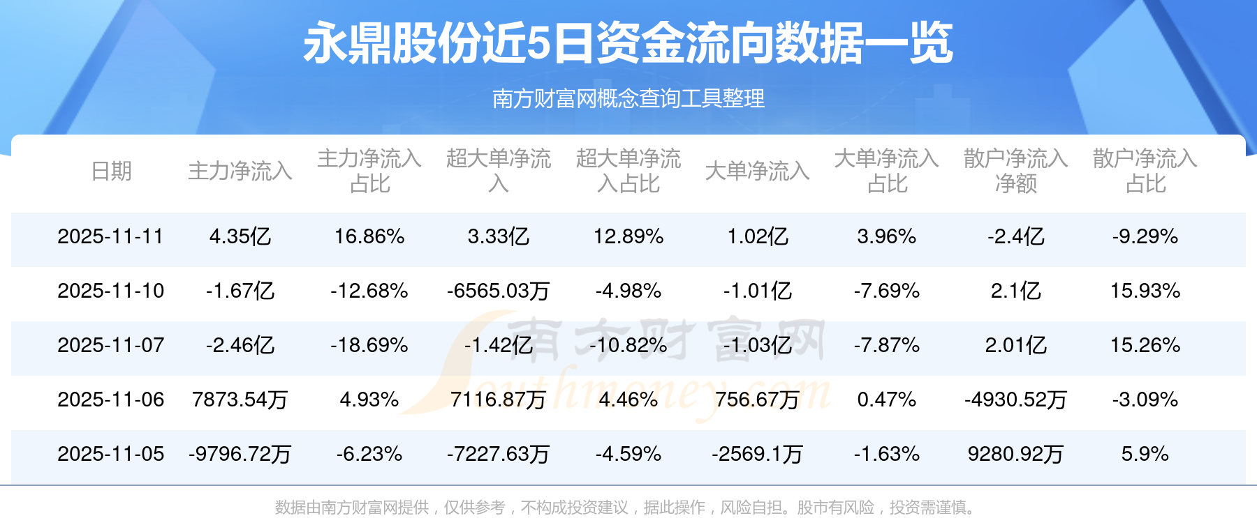 11月11日消息,永鼎股份主力凈流入4.35億元,超大單凈流入3.33億元,散戶凈流出2.4億元。