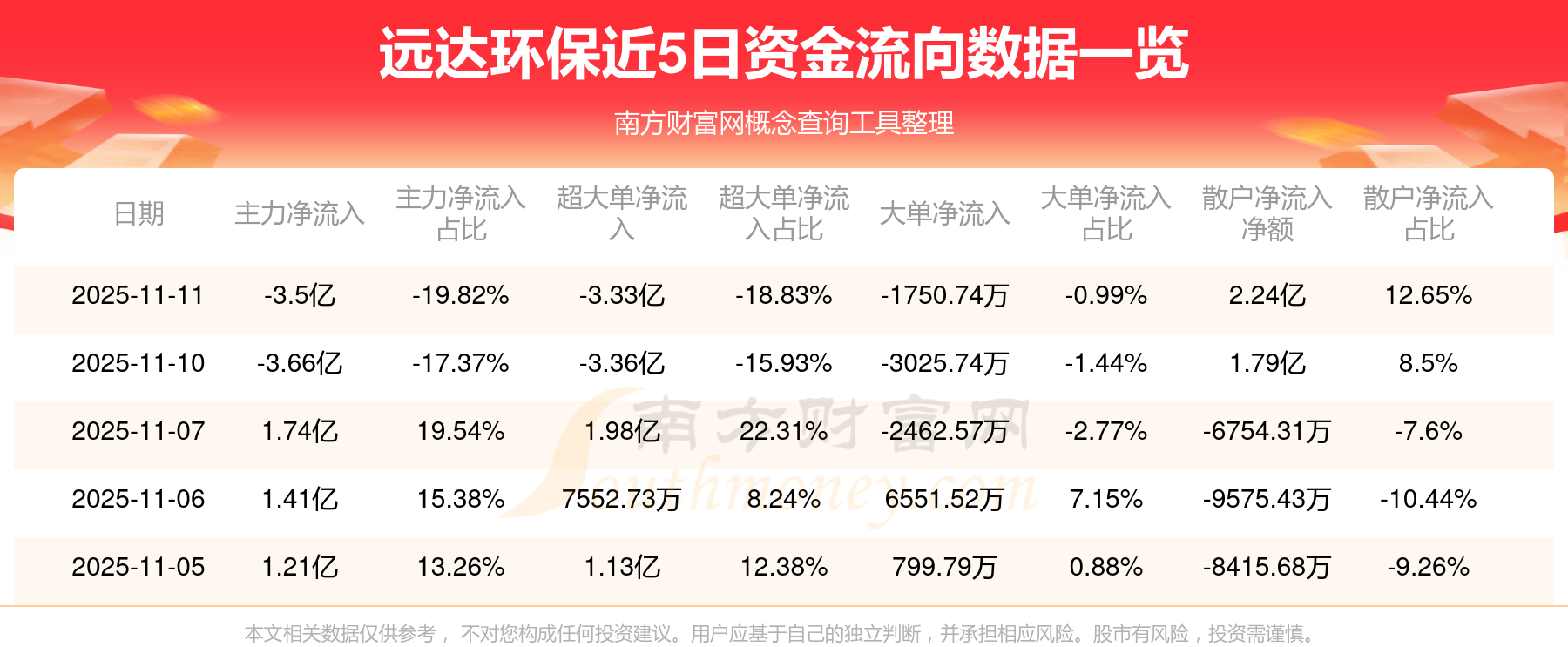 11月11日消息,遠(yuǎn)達(dá)環(huán)保資金凈流出3.5億元,超大單資金凈流出3.33億元,換手率0.45%,成交金額5207.22萬元。
