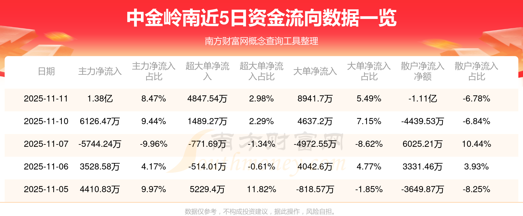 11月11日消息,中金嶺南主力資金凈流入1.38億元,超大單資金凈流入4847.54萬元,散戶資金凈流出1.11億元。