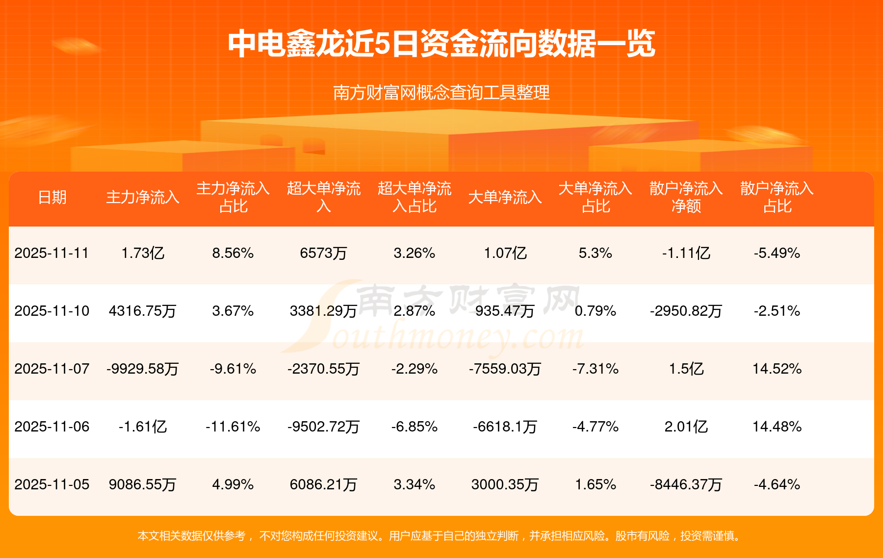 資金流向數(shù)據(jù)方面,11月11日主力資金凈流流入1.73億元,超大單資金凈流入6573萬元,大單資金凈流入1.07億元,散戶資金凈流出1.11億元。