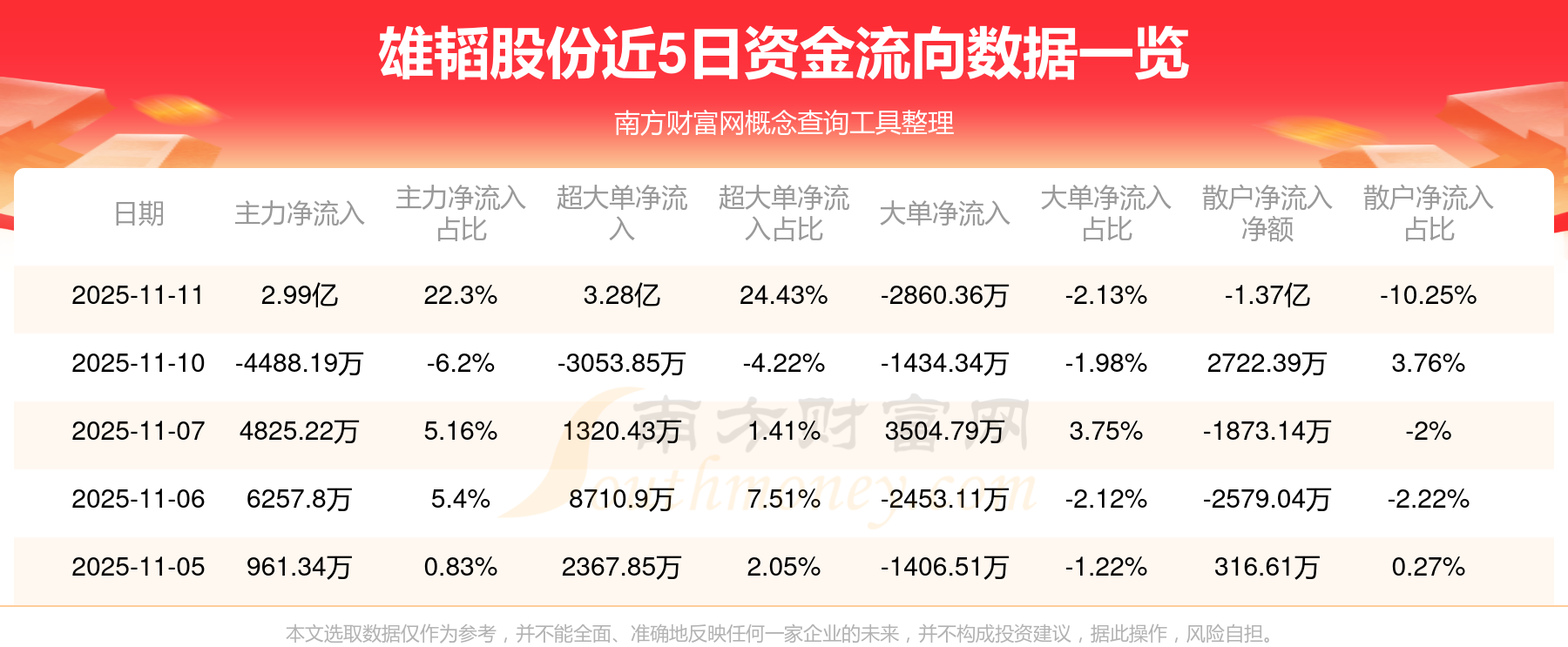 11月11日該股主力凈流入2.99億元,超大單凈流入3.28億元,大單凈流出2860.36萬(wàn)元,中單凈流出1.62億元,散戶凈流出1.37億元。