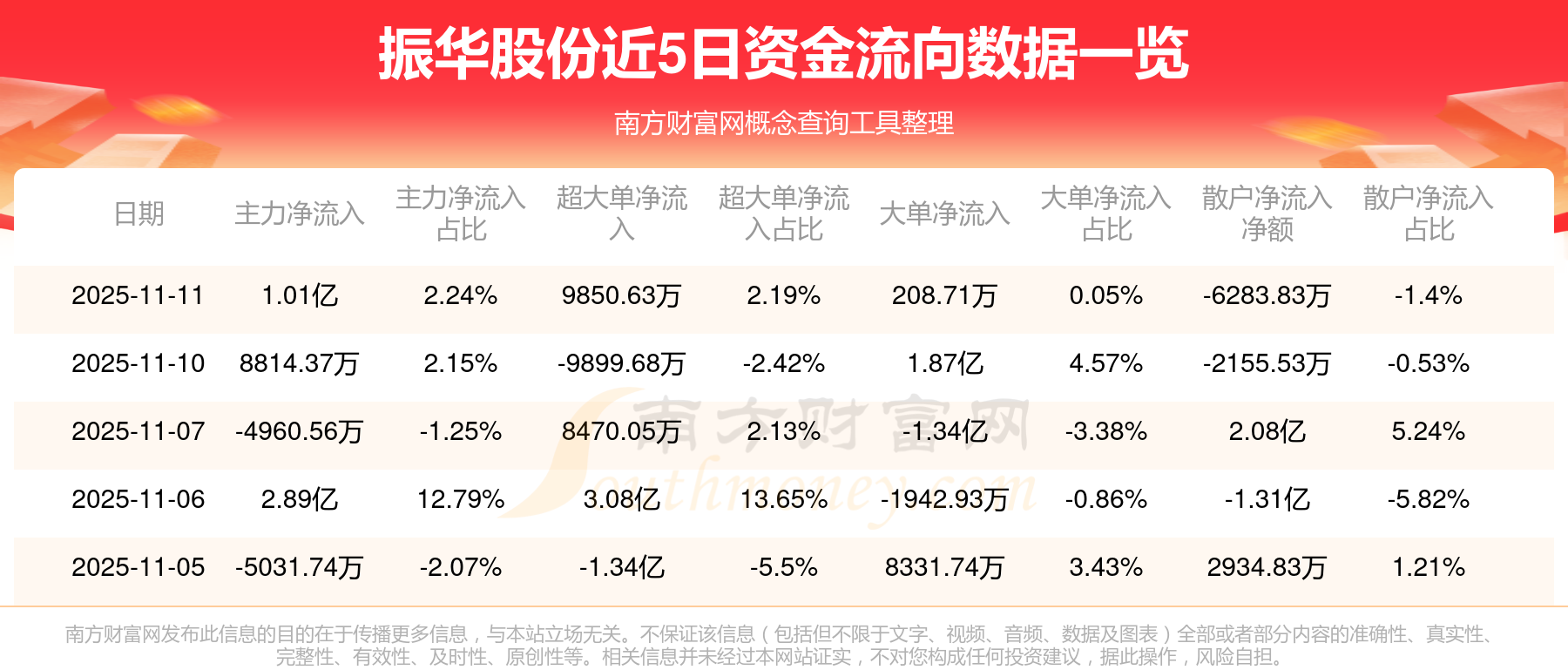 近5日資金流向一覽見下表: