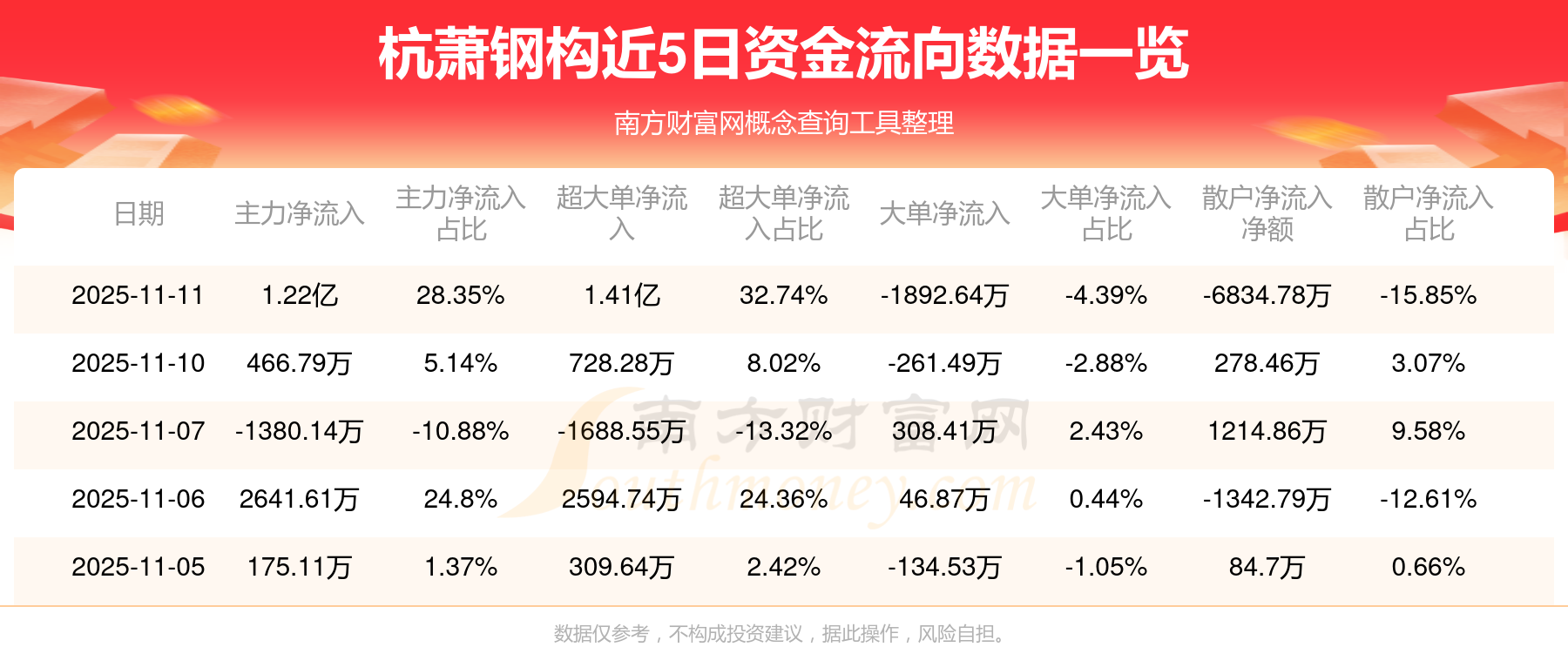 11月11日消息,杭蕭鋼構(gòu)主力資金凈流入1.22億元,超大單資金凈流入1.41億元,散戶資金凈流出6834.78萬元。