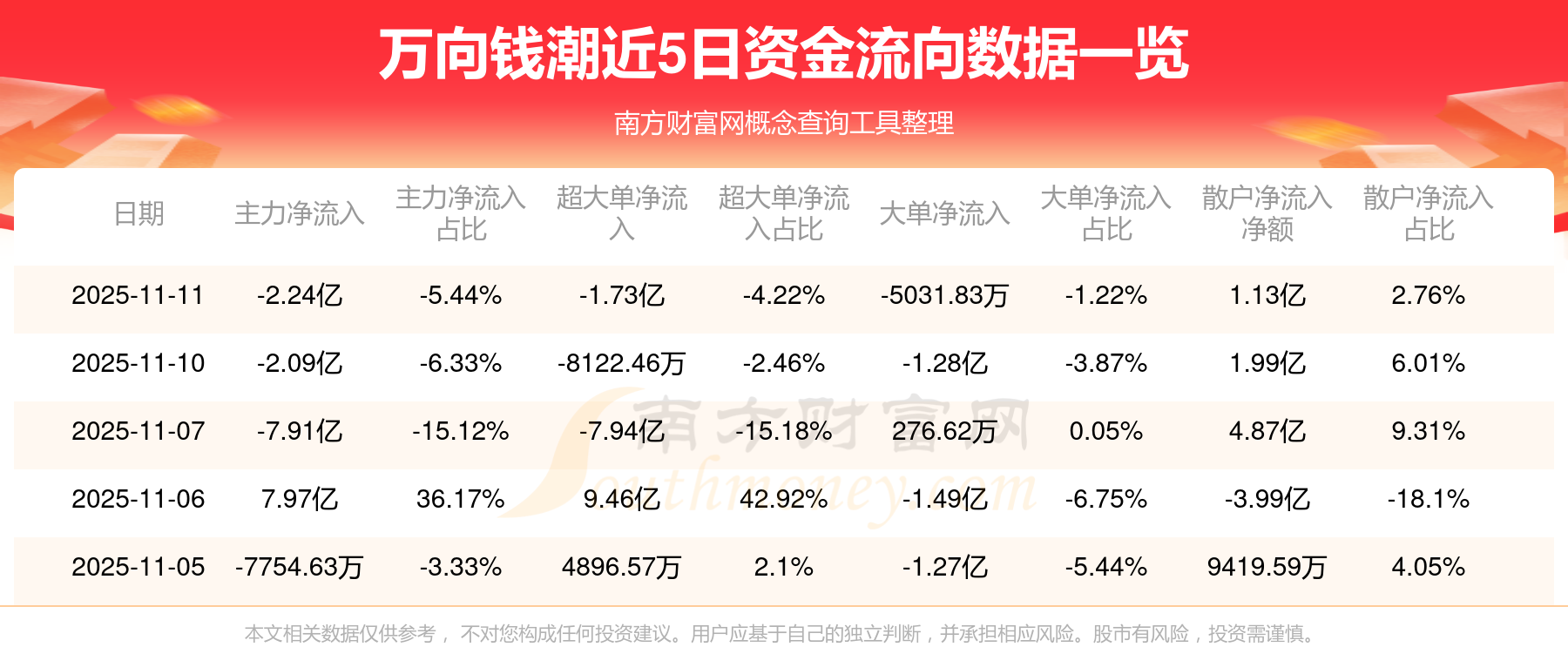 11月11日消息,萬(wàn)向錢潮主力資金凈流出2.24億元,超大單資金凈流出1.73億元,散戶資金凈流入1.13億元。